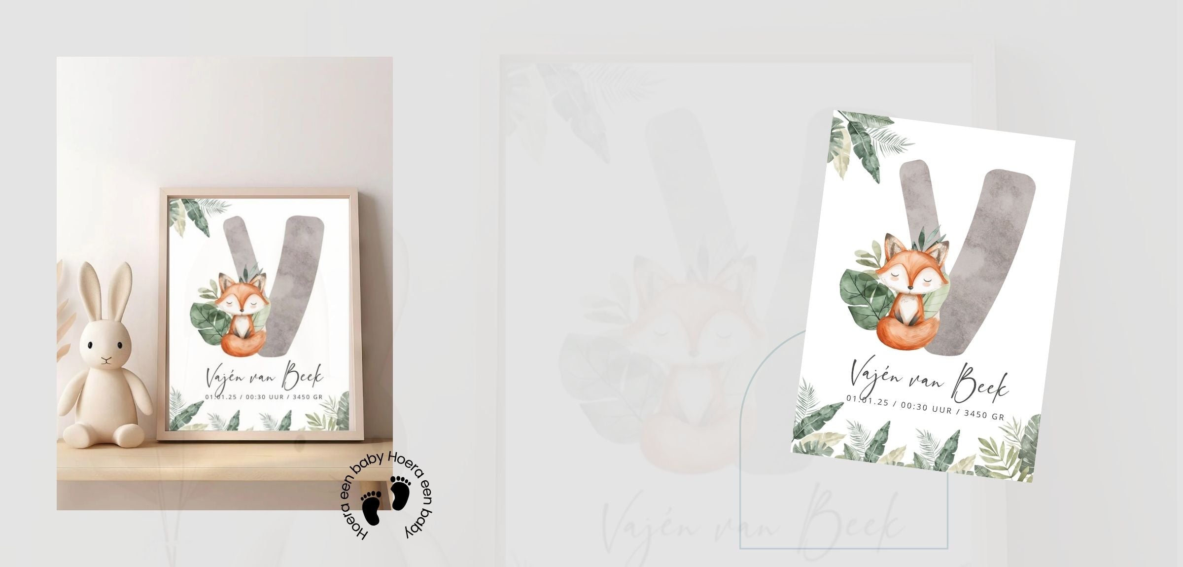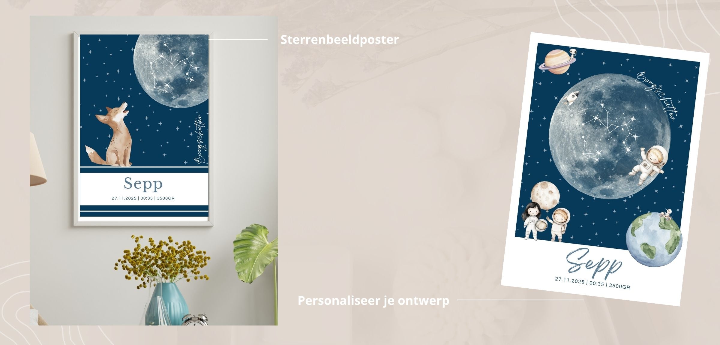 Deze sterrenbeeldposters zijn een originele en persoonlijke manier om de geboorte van je kindje te vieren. Met een heldere maan, het sterrenbeeld van je kindje en een dromerige sterrenhemel straalt dit ontwerp rust én karakter uit. De illustratie van het vosje dat omhoog kijkt, voegt een speelse en warme touch toe – perfect voor een stoere, lieve baby- of kinderkamer.