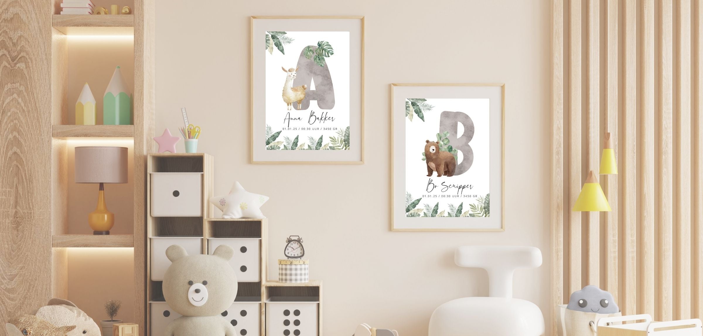 Geef een unieke en persoonlijke touch aan de babykamer met onze geboorteposter. Deze prachtige poster zet de eerste letter van de naam van je kindje in de spotlight, gevuld met levendige safari-elementen zoals schattige dieren, tropische bladeren en natuurlijke tinten.